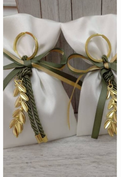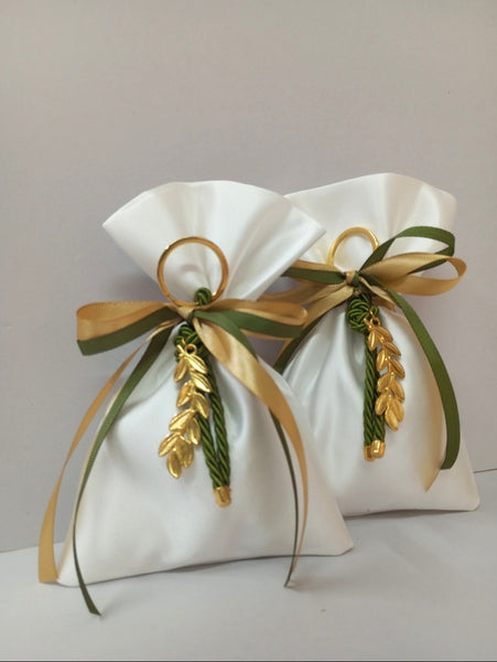 Stylish Satin pouches with gold plated olive branch keychain , a beautiful keepsake for your guests !