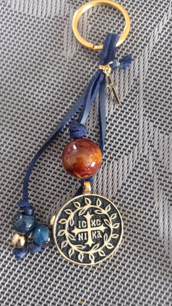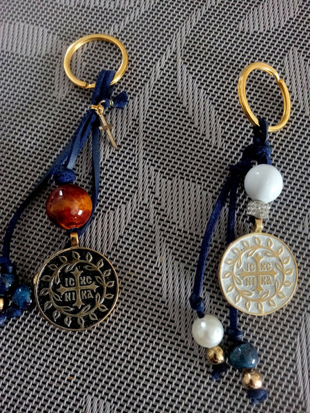 Gold plated & enameled keyhain with ceramic beads and cross.Can be applied to baptism/wedding favours as a beautiful keepsake too.