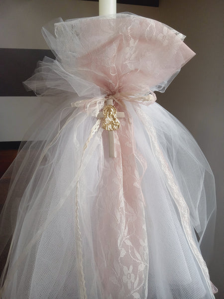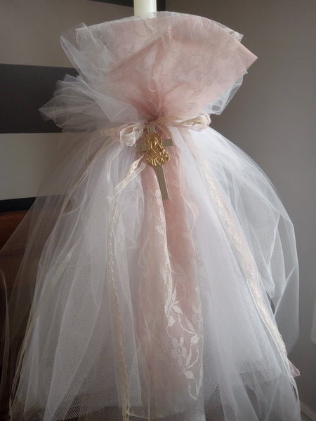 Baptism lambada with White toul with dusty pink bow and laces and cross for your little princess!